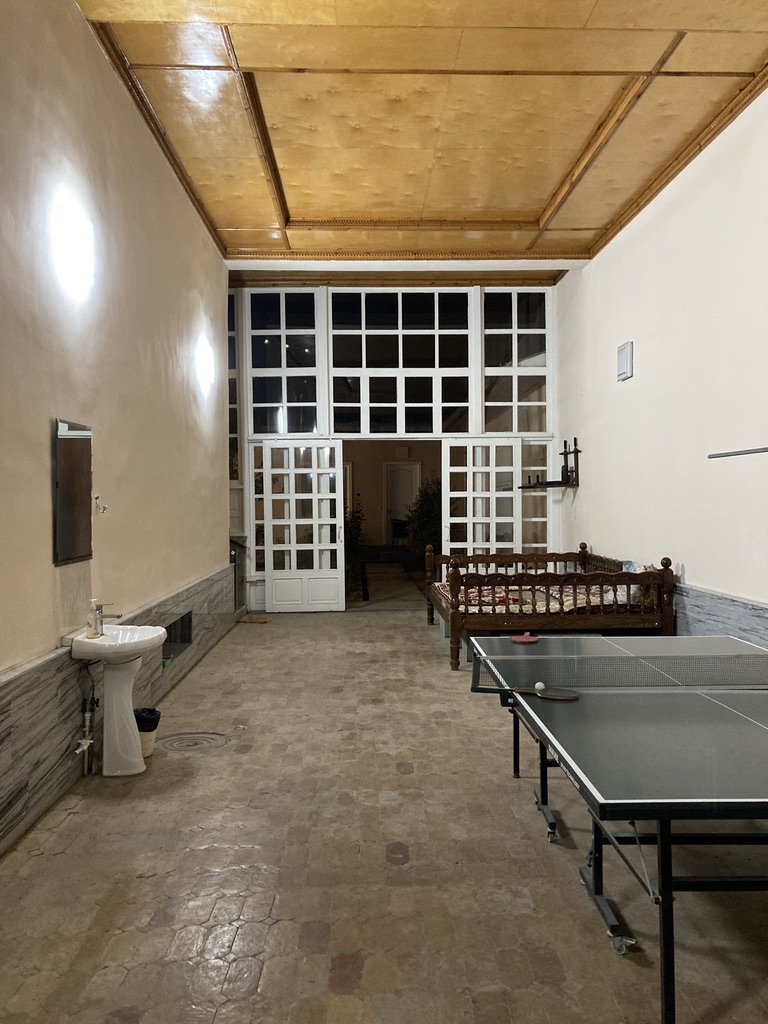 The opening of NOMSIZ was very low-key and inclusive. The venue itself—the Tashkent Film School—has a home-like feeling. It is a magnetic crossover of private and public space: the entrance features a ping-pong table, a traditional tapchan, and a small, flowered courtyard with a bar, while the Kinoxona cinema is located downstairs. The opening film, Journal Syriote, also channelled this atmosphere.